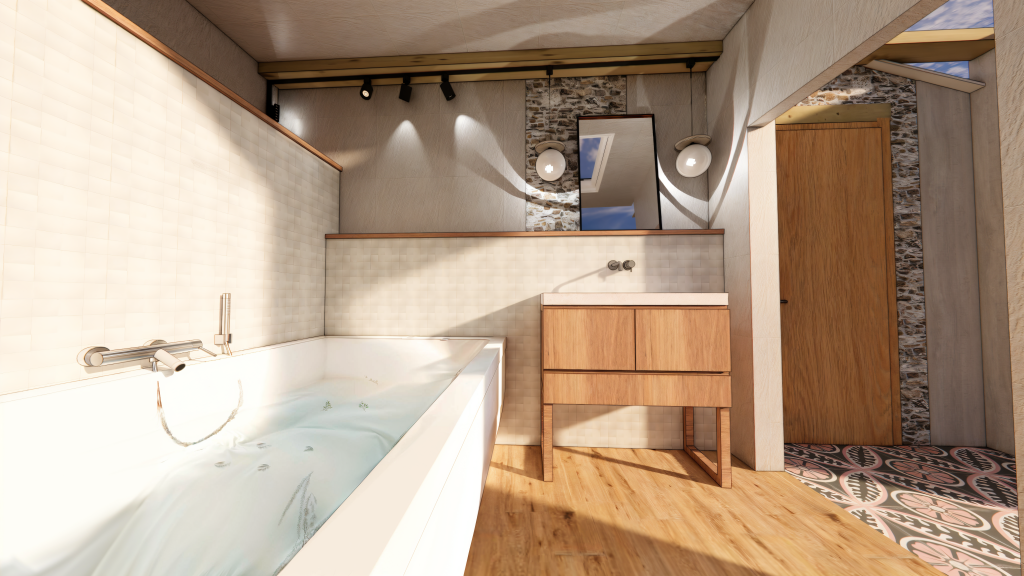 La salle de bain, située dans l’extension, est pensée comme un espace de détente autour d’une baignoire balnéo déjà acquise.