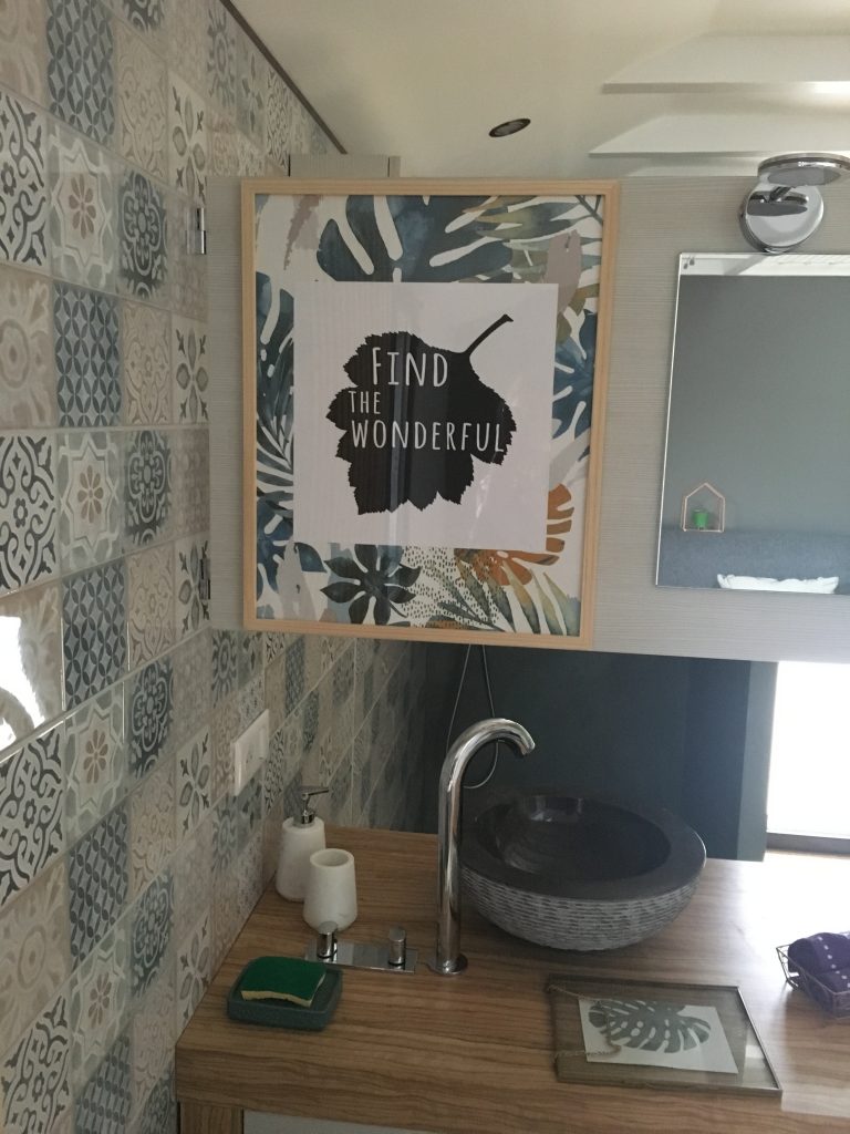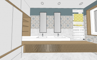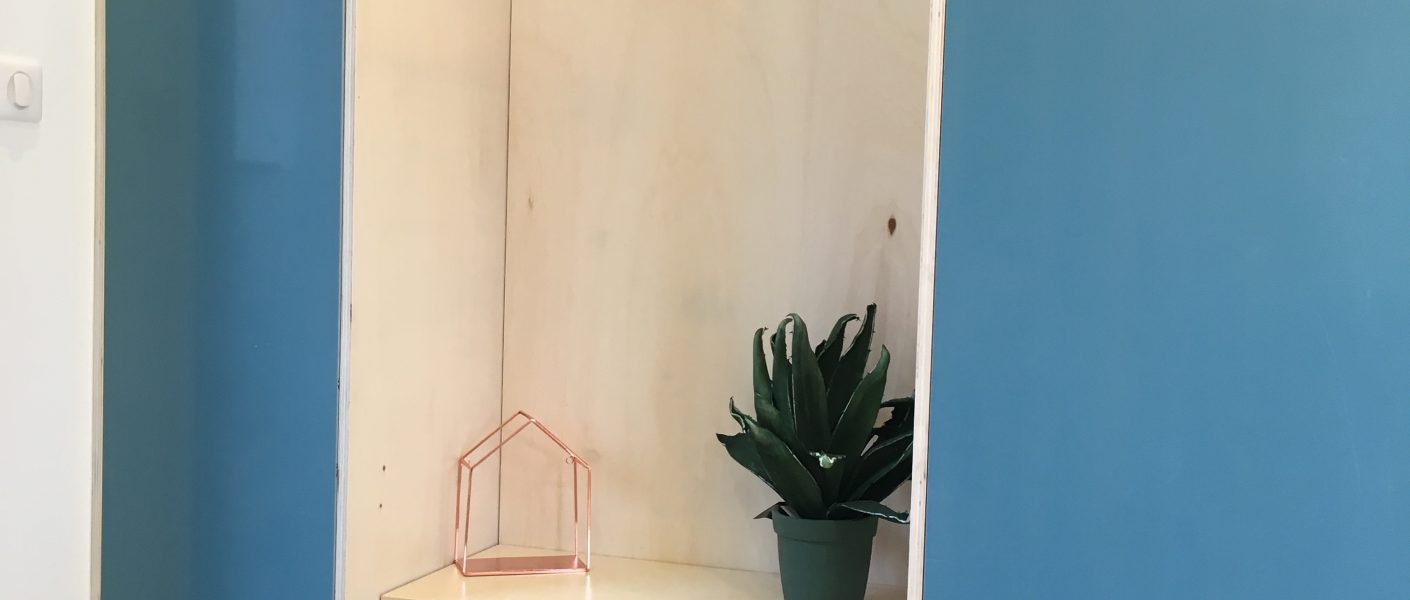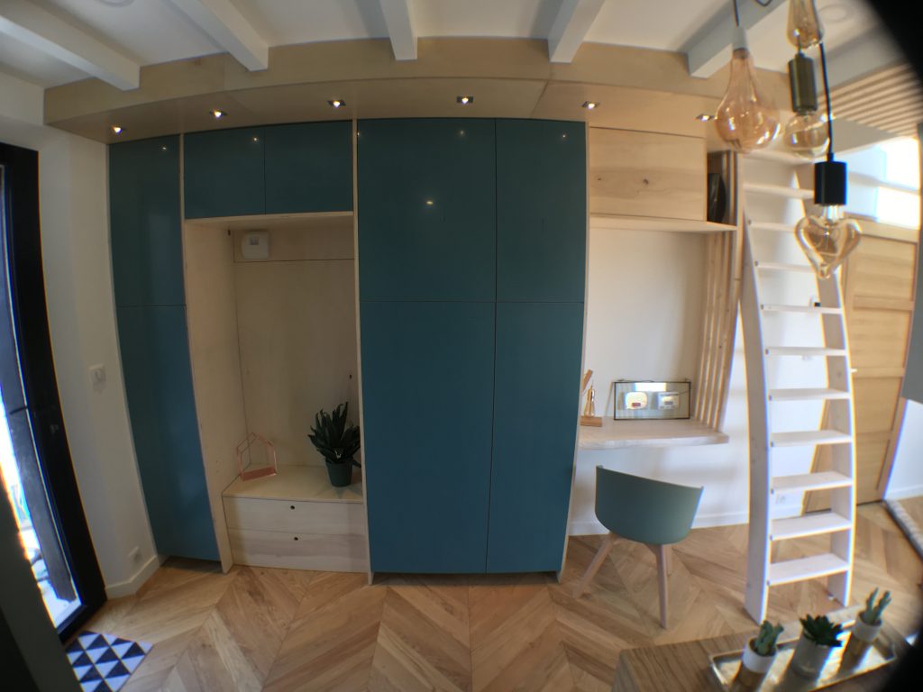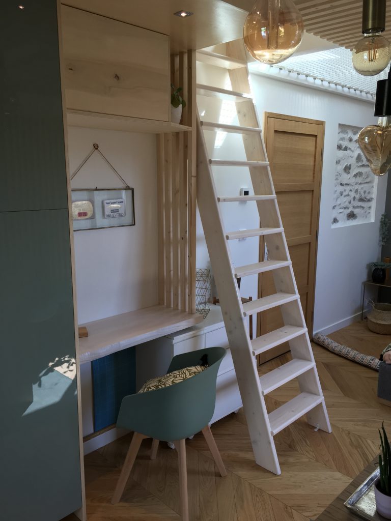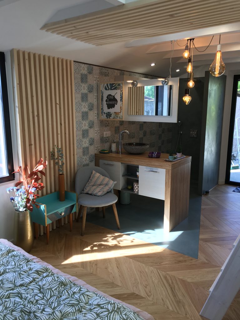 En terme de style, nous sommes sur des notes scandinaves vintage. Un parquet massif en chêne posé en pointe de Hongrie donne beaucoup de caractère à la pièce. Un béton ciré vert de gris dans la partie salle d’eau vient la délimiter visuellement. Le meuble vasque est posé en ilot dans la pièce, laissant un jeu de miroirs et des rangements de chaque côté. Un grand dressing est créé, intégrant un petit bureau. L’accès à l’ancien local sanitaire depuis la pièce de vie est condamné et vient accueillir le chauffe-eau. Un banc mobile intégré au dressing vient le cacher. Une arche décorative en sapin vient délimiter visuellement la partie couchage de la partie salle d’eau et dressing.