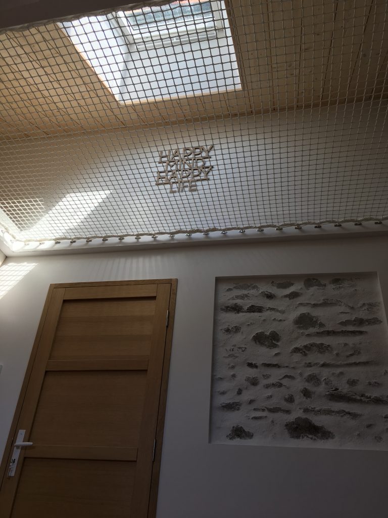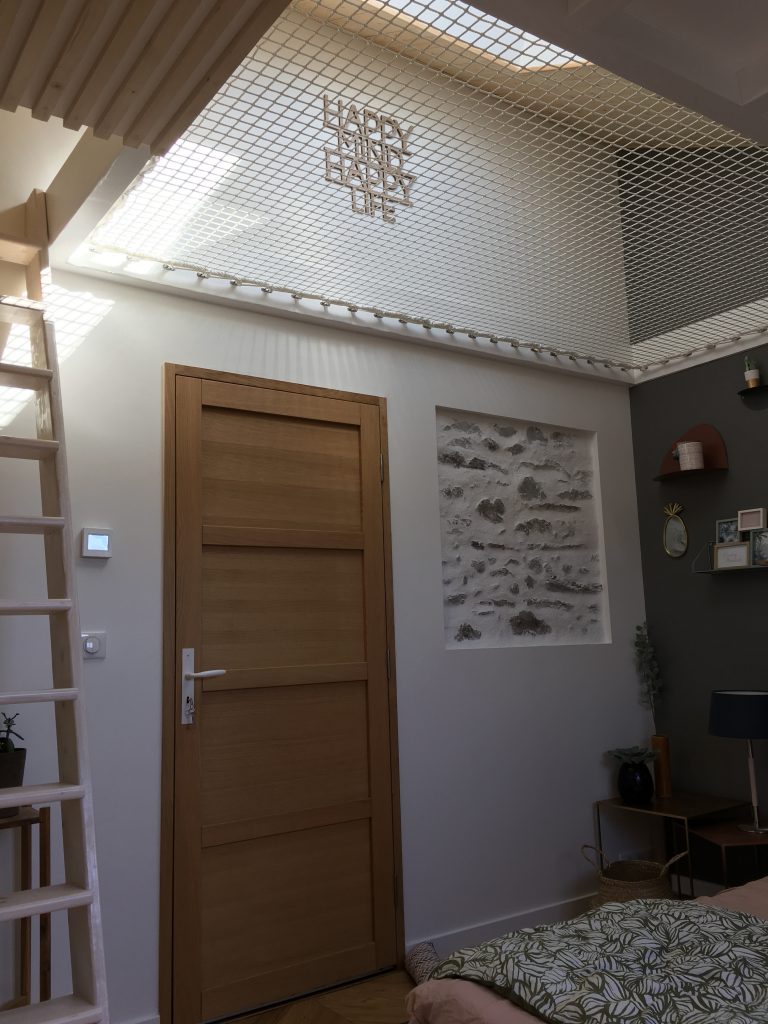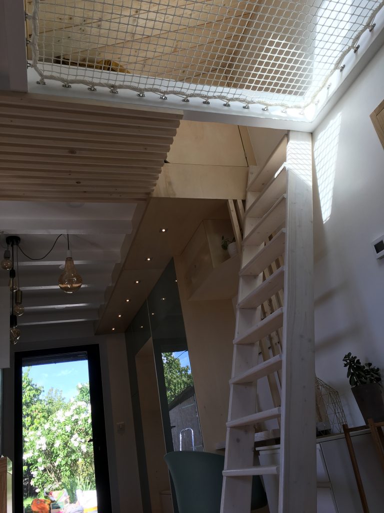 • création d’une suite parentale spacieuse comprenant une partie nuit, une salle d’eau ouverte sur la chambre, un dressing avec un coin bureau, une aire de détente avec un filet de catamaran suspendu et un grenier pouvant accueillir un couchage.
