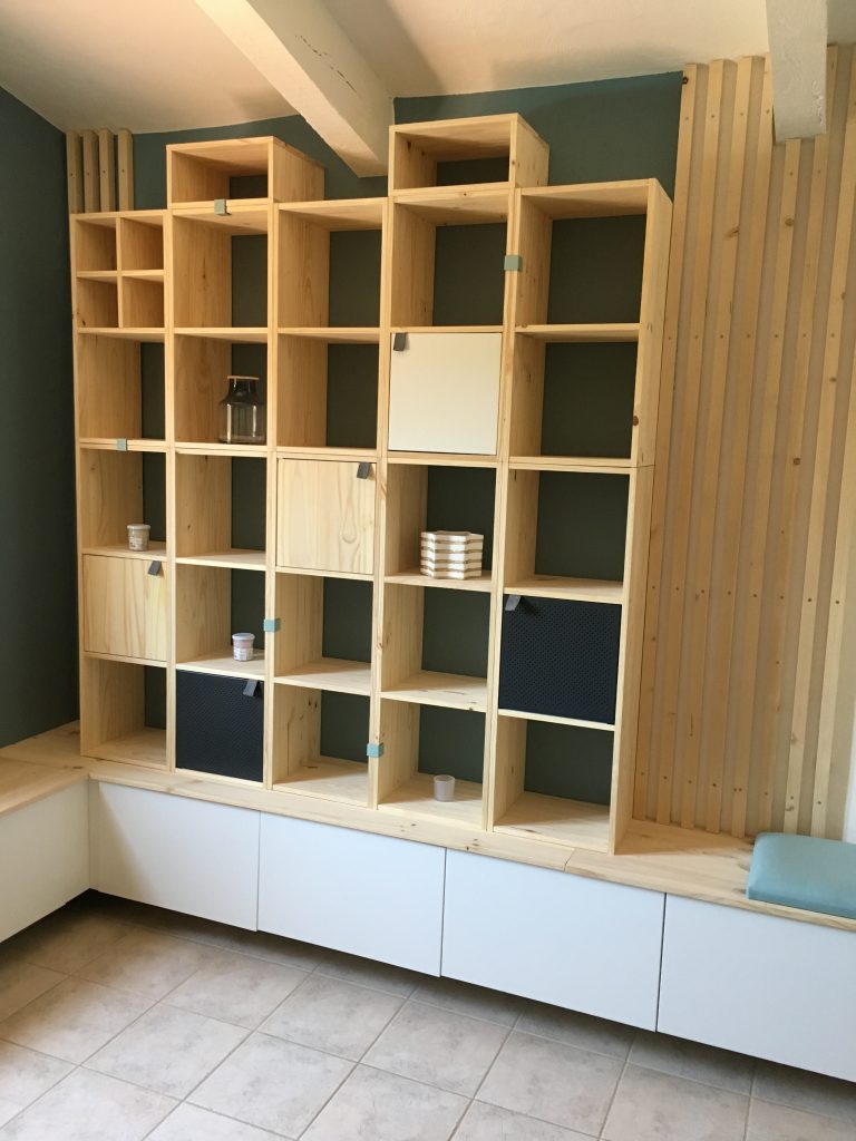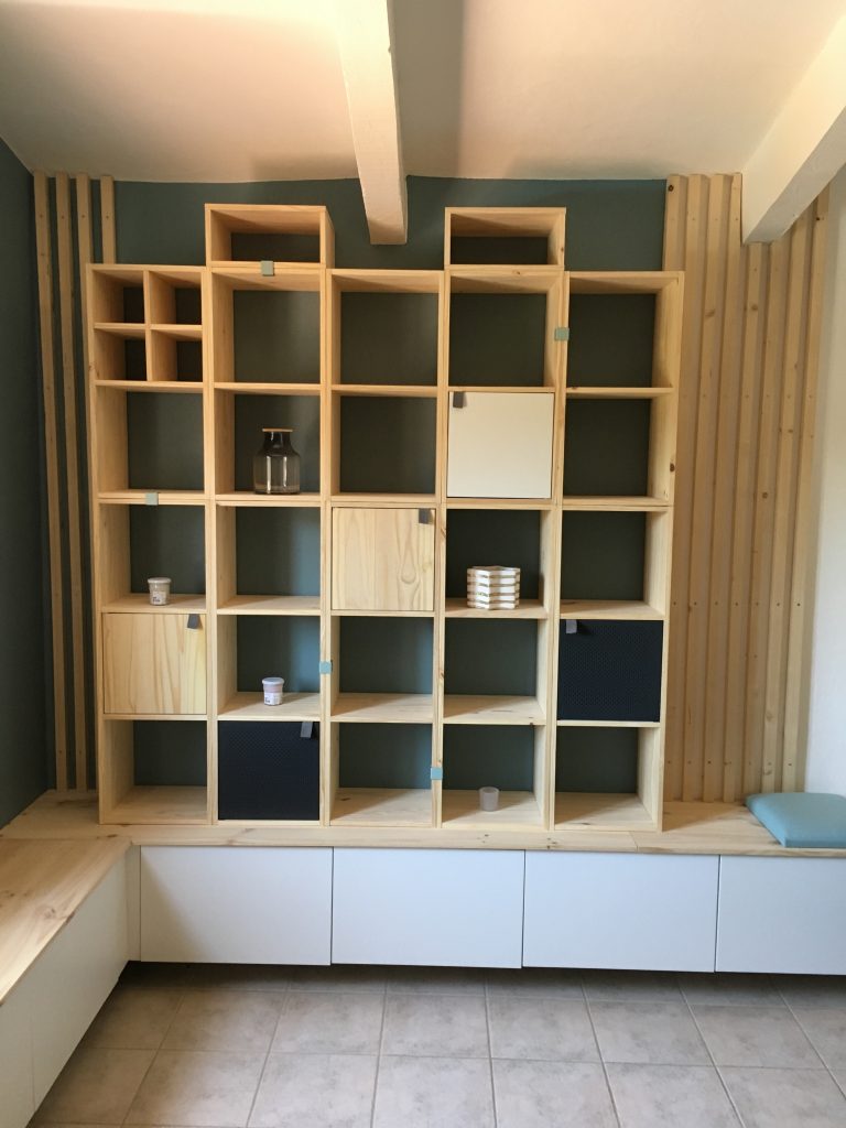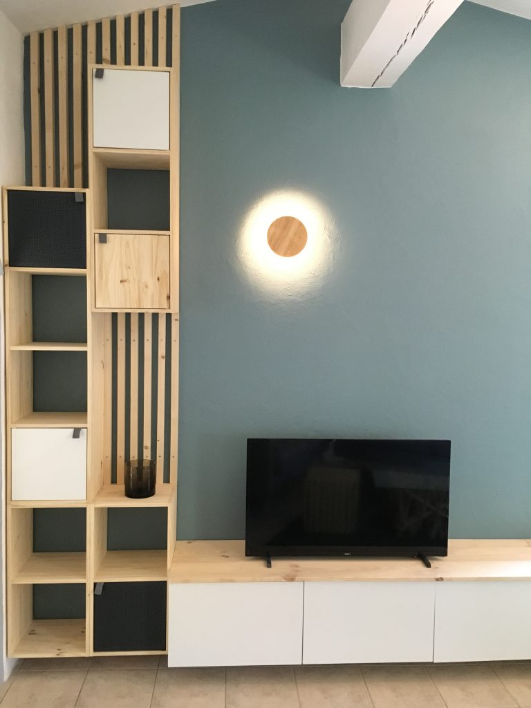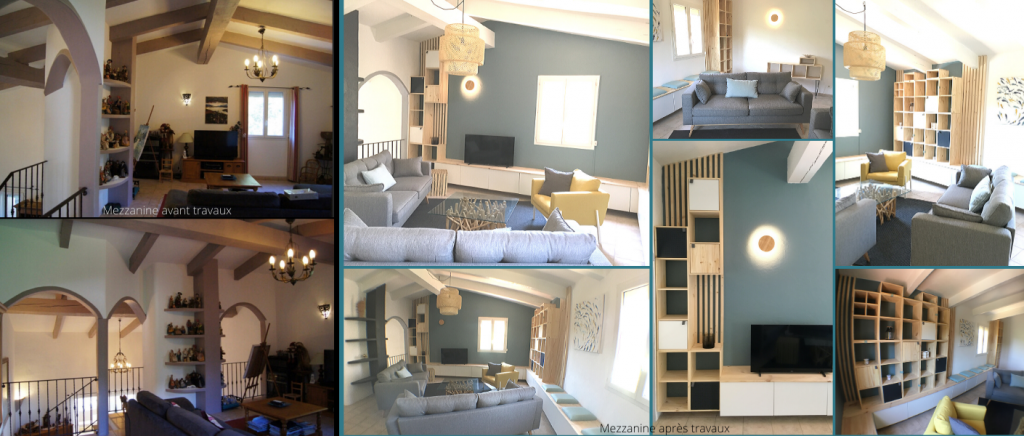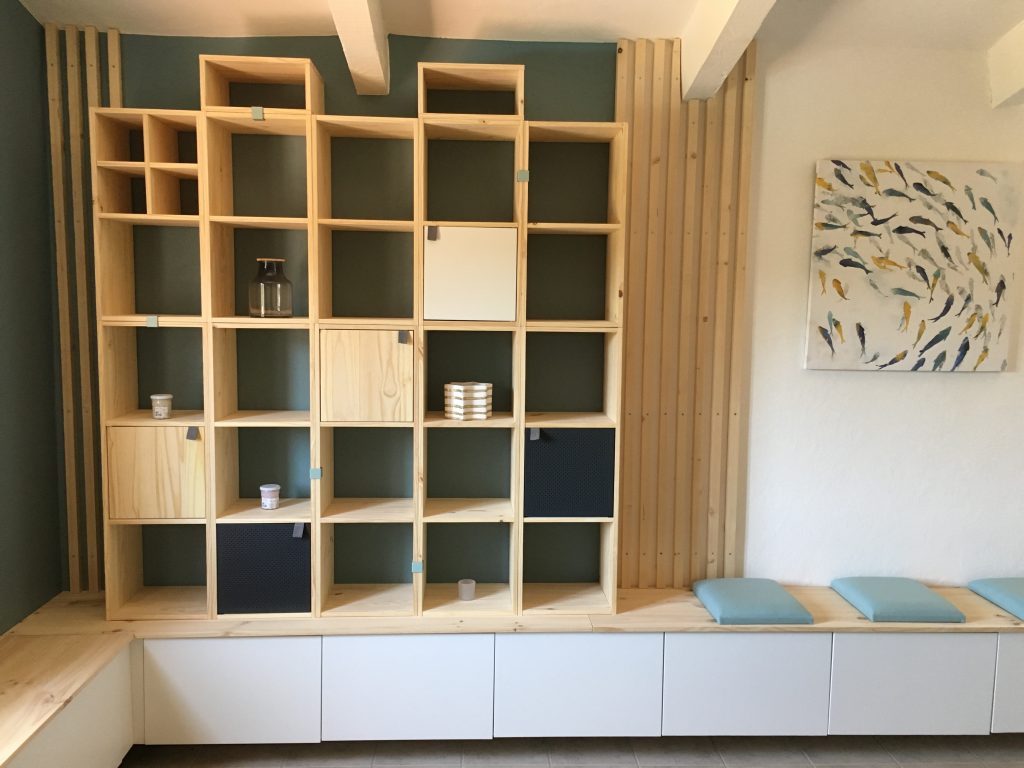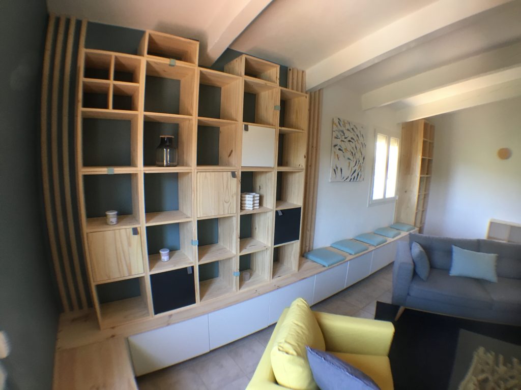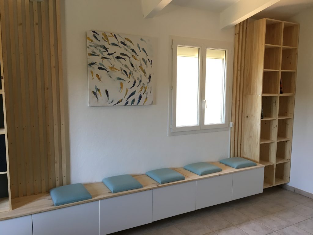 A l’étage, le salon est installé sur la mezzanine. La décoration était pesante dans cette pièce, où toutes les boiseries et encadrures de portes et ouvertures avaient été peintes en taupe. Une ambiance bord de mer est donnée à cette pièce. Un aménagement sur mesure est conçu pour moderniser et donner un peu d’âme à cette pièce. Il est réalisé avec des éléments du commerce et un habillage en planches et tasseaux de sapin, pour un gain économique et un rendu impeccable.