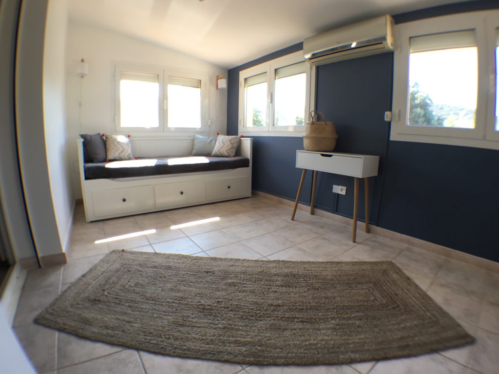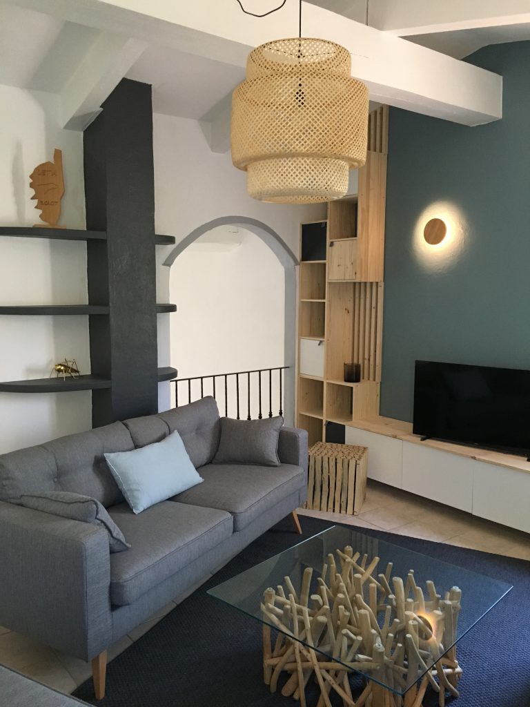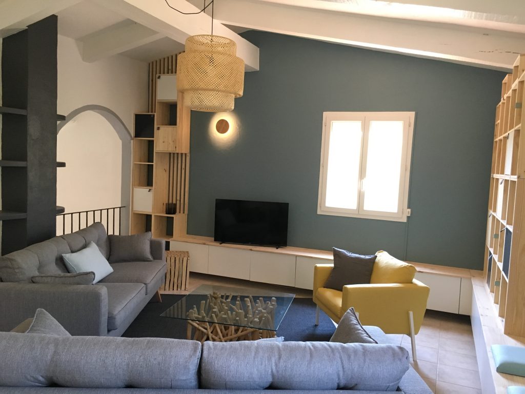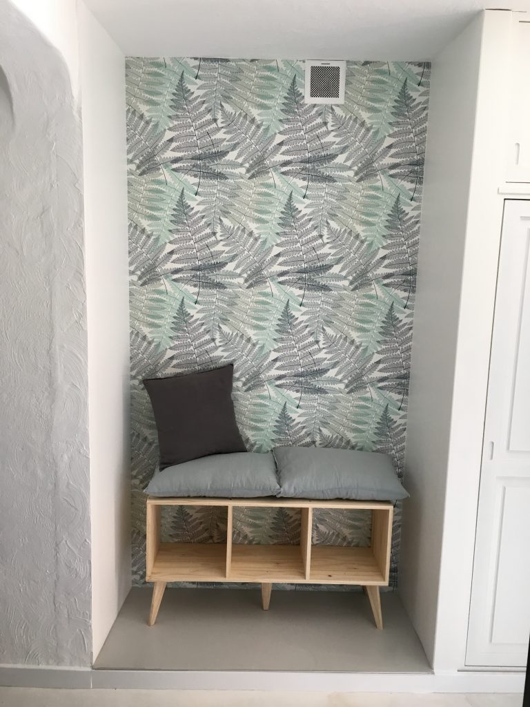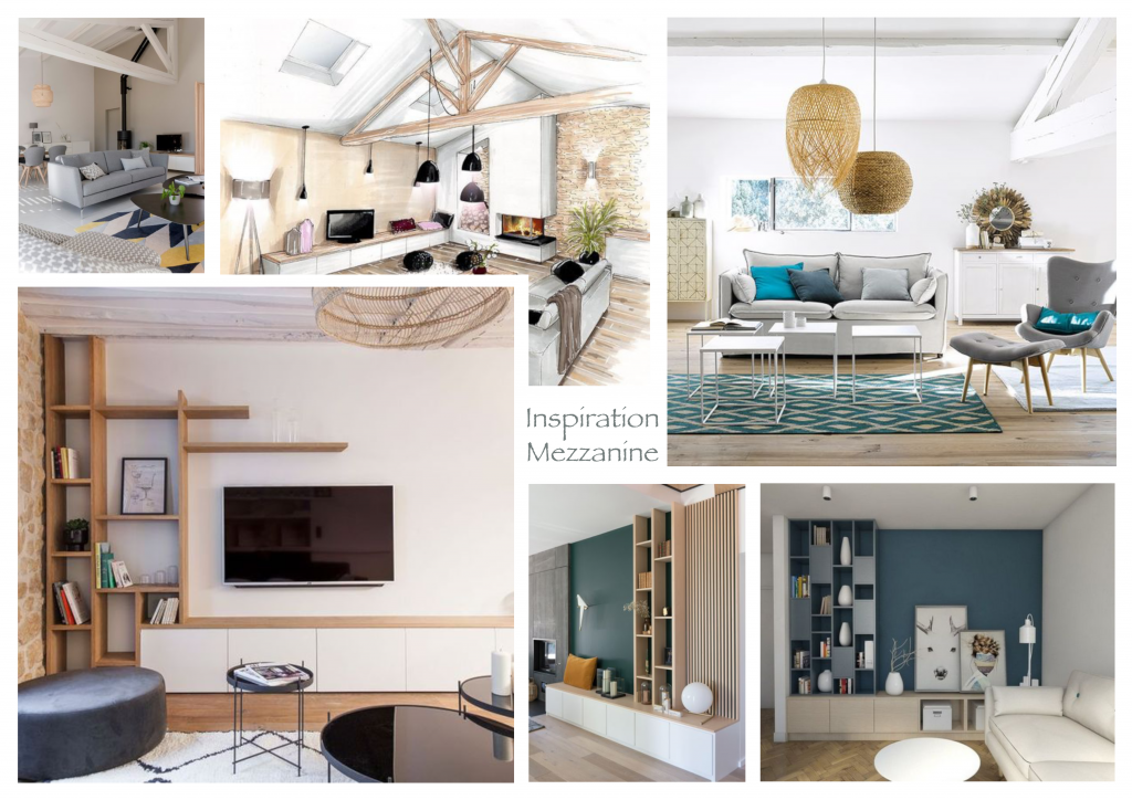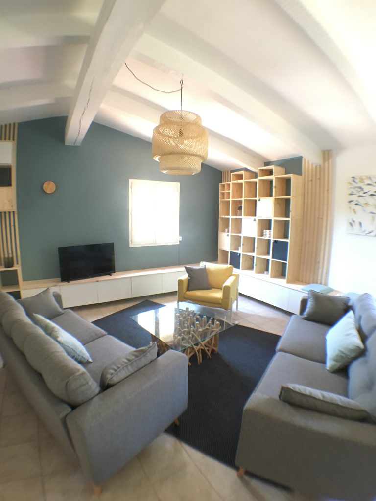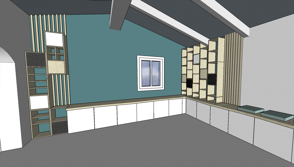 A l’étage, le salon est installé sur la mezzanine. La décoration était pesante dans cette pièce, où toutes les boiseries et encadrures de portes et ouvertures avaient été peintes en taupe. Une ambiance bord de mer est donnée à cette pièce. Un aménagement sur mesure est conçu pour moderniser et donner un peu d’âme à cette pièce. Il est réalisé avec des éléments du commerce et un habillage en planches et tasseaux de sapin, pour un gain économique et un rendu impeccable.