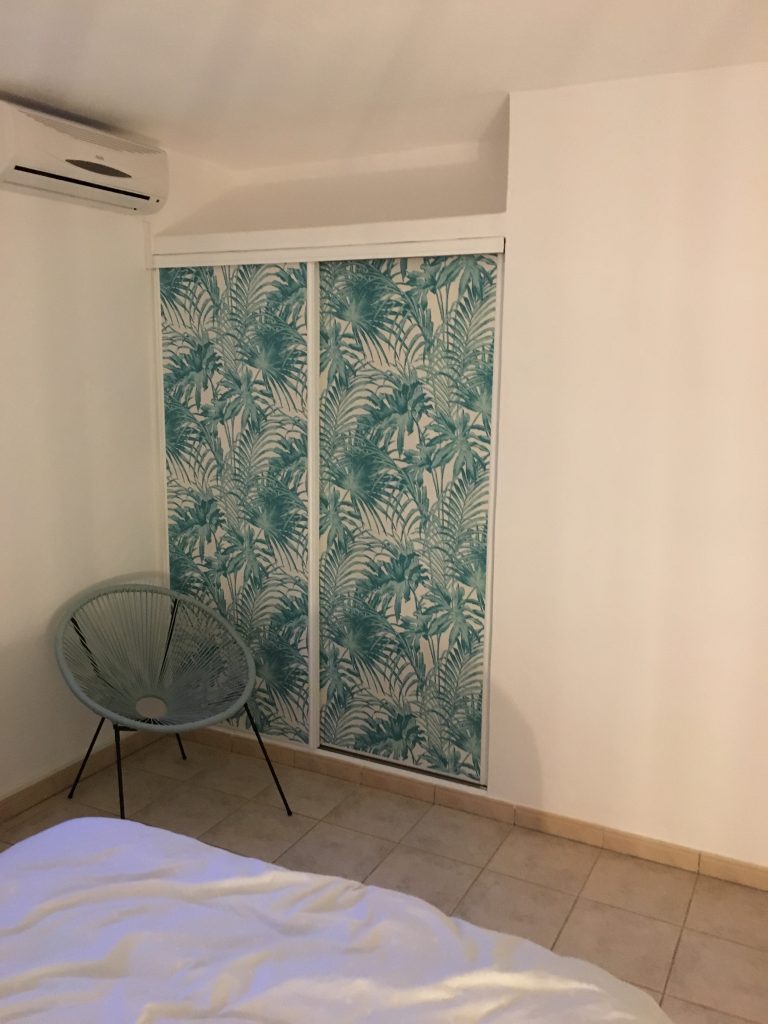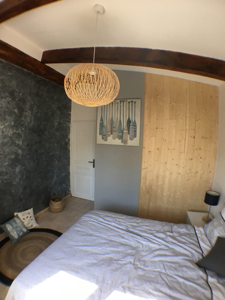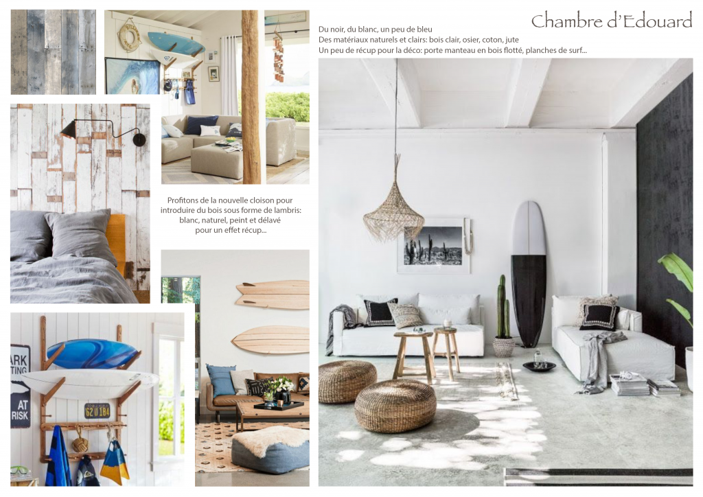 La chambre accolée quant à elle est souhaitée avec une ambiance « surf ». On profite alors de la suppression du placard au profit de la salle d’eau pour venir ajouter un peu de lambris en finition brut de sciage, et en face, un mur en enduit fin métallisé vient réfléchir la lumière et agrandir la pièce malgré sa couleur noire.