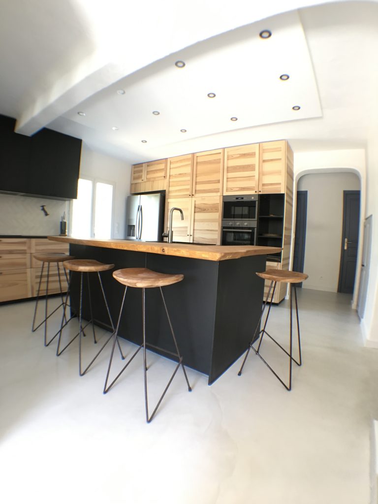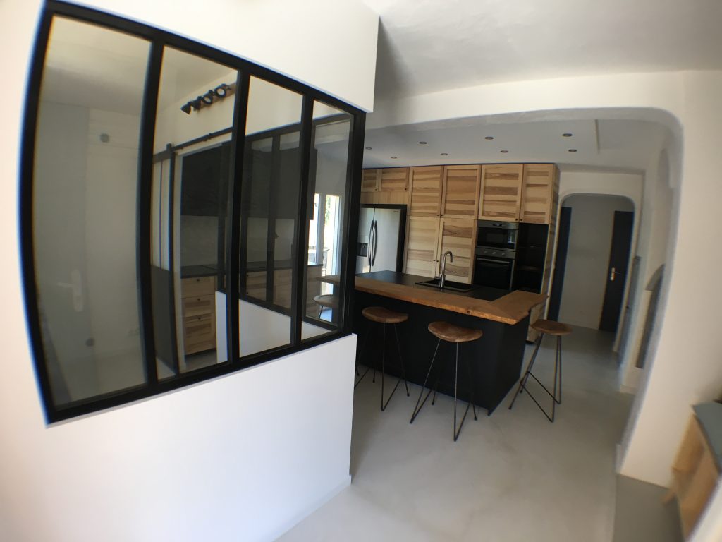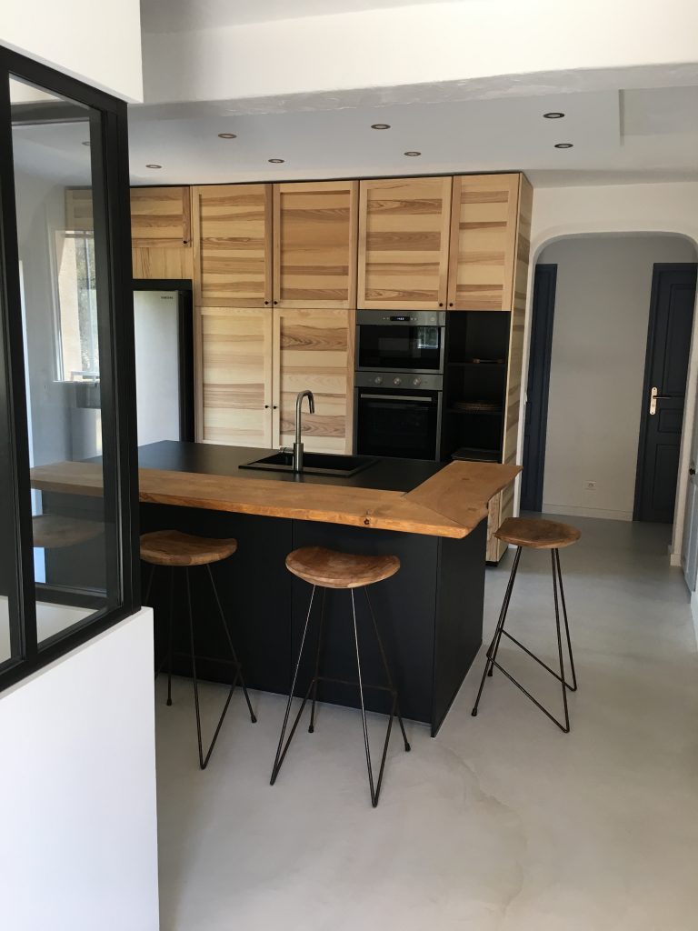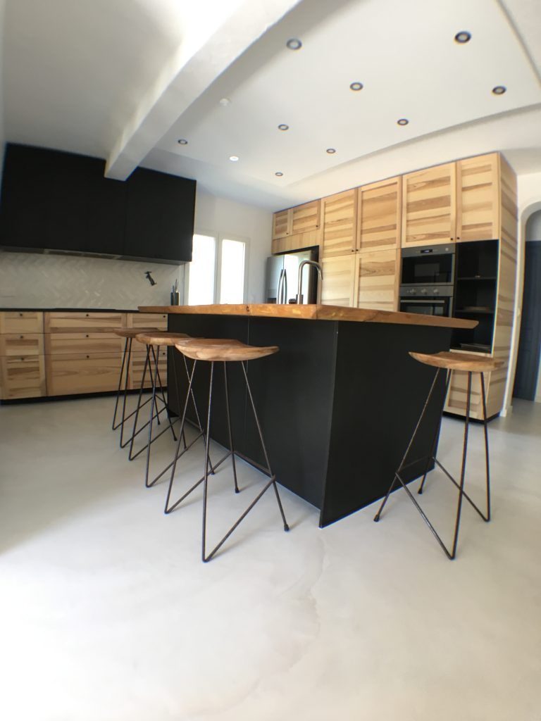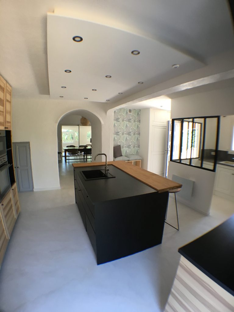 Dans la cuisine, les cloisons ont été retirées, pour plus d’espace et de luminosité. La cuisine a été déplacée près de la future terrasse et un bel îlot central a pris place. Une fenêtre a été remplacée par une baie vitrée donnant accès sur une toute nouvelle terrasse suspendue. Une buanderie a pris la place de l’ancienne cuisine, cloisonnée par une verrière d’angle, pour conserver la luminosité et garder une sensation d’espace. Dans une démarche écologique et économique, une partie de l’aménagement de l’ancienne cuisine a pu être conservé pour l’arrière cuisine et relooké avec des produits de qualité. Pour moderniser la maison, un béton ciré est choisi pour l’intégralité du sol de la pièce de vie (60m2)