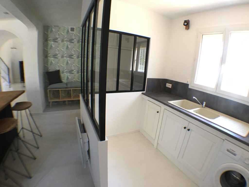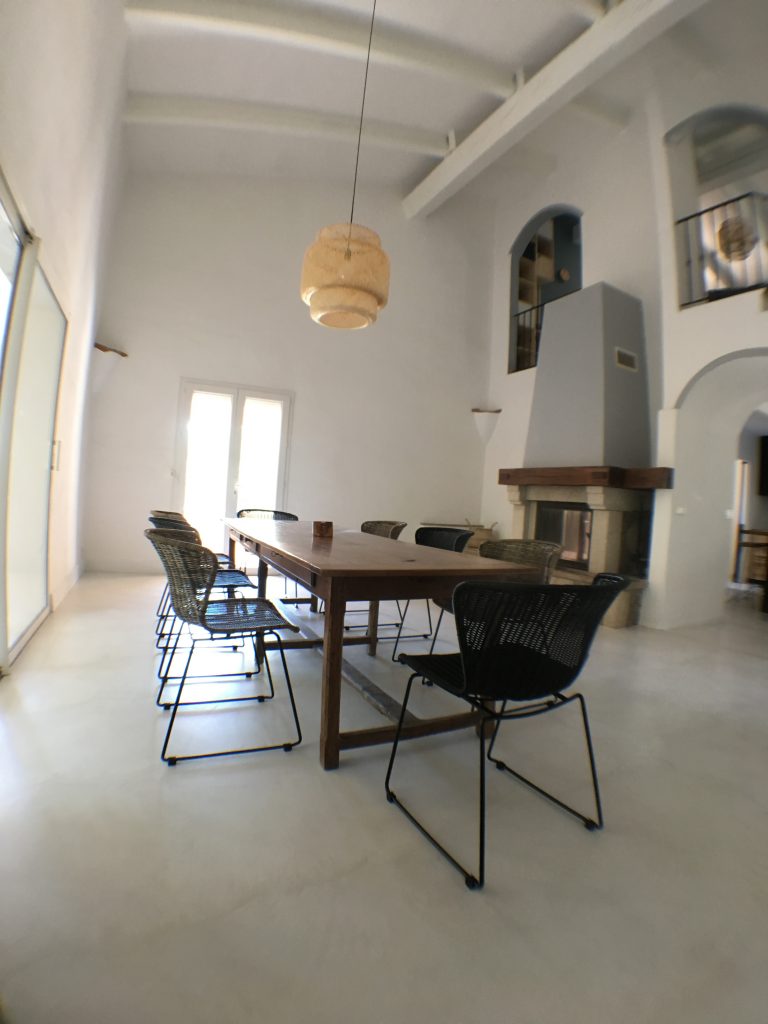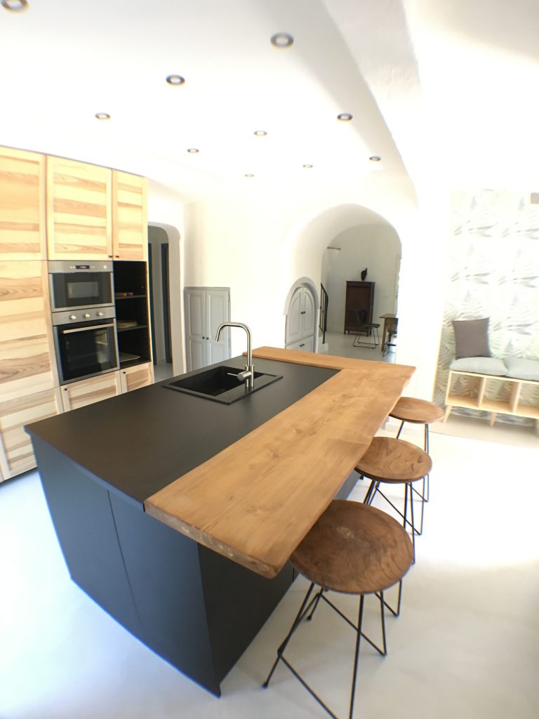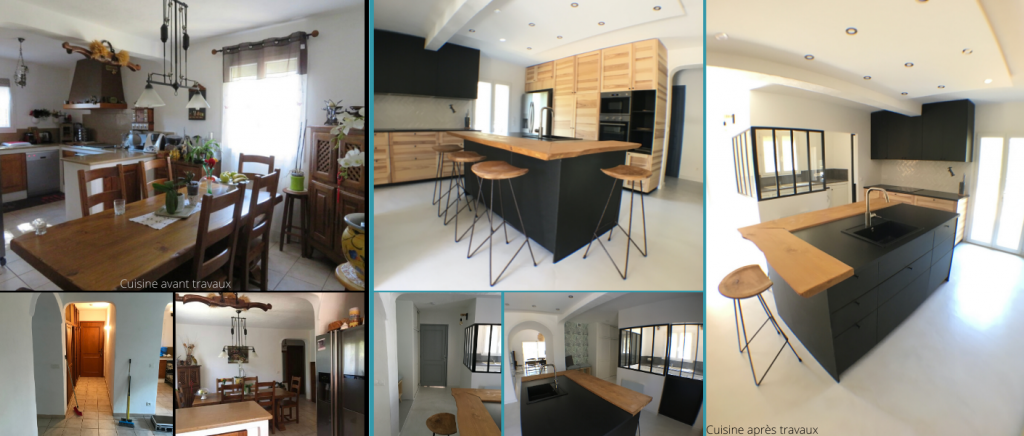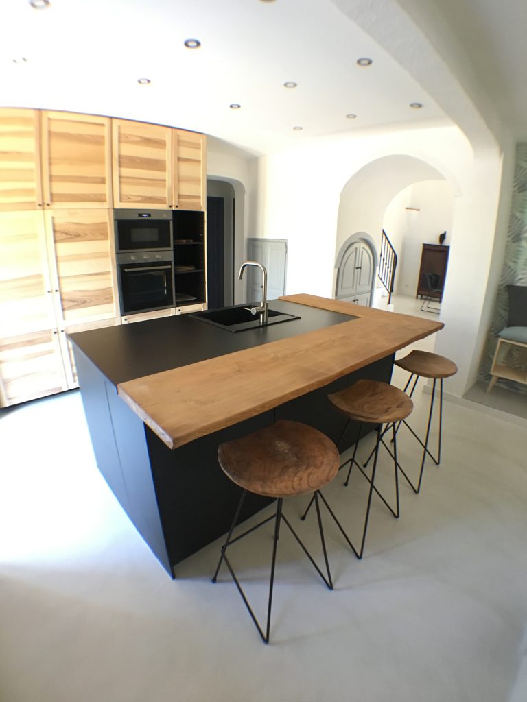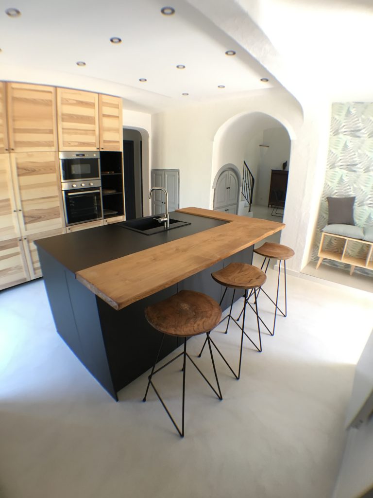 Dans la cuisine, les cloisons ont été retirées, pour plus d’espace et de luminosité. La cuisine a été déplacée près de la future terrasse et un bel îlot central a pris place. Une fenêtre a été remplacée par une baie vitrée donnant accès sur une toute nouvelle terrasse suspendue. Une buanderie a pris la place de l’ancienne cuisine, cloisonnée par une verrière d’angle, pour conserver la luminosité et garder une sensation d’espace. Dans une démarche écologique et économique, une partie de l’aménagement de l’ancienne cuisine a pu être conservé pour l’arrière cuisine et relooké avec des produits de qualité. Pour moderniser la maison, un béton ciré est choisi pour l’intégralité du sol de la pièce de vie (60m2)