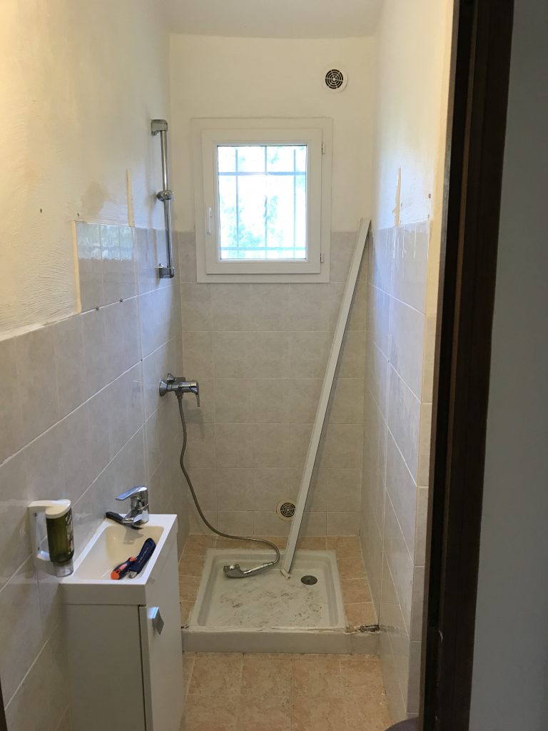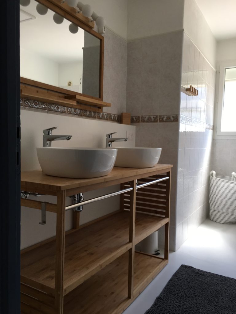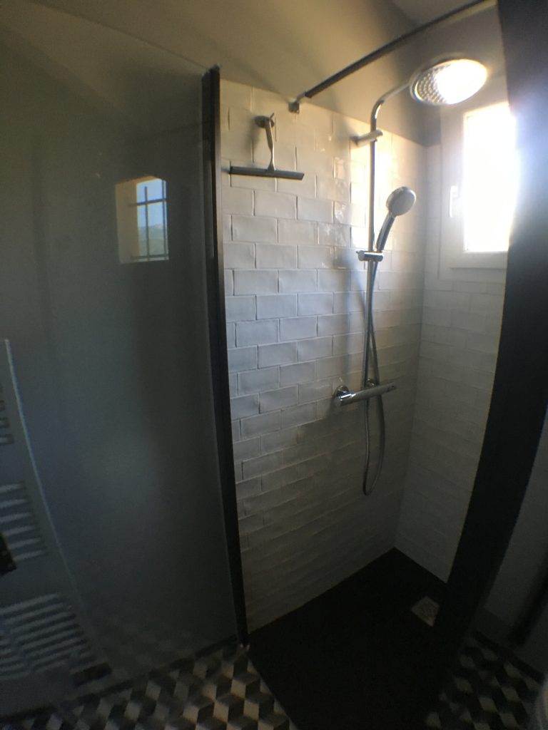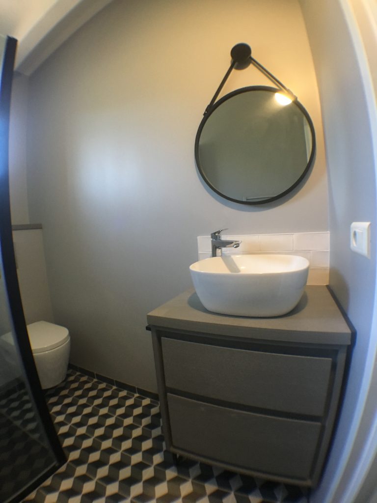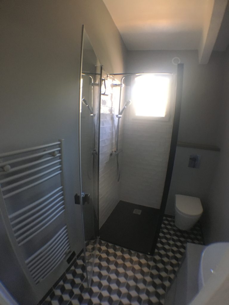 A l’étage, la salle d’eau est exigüe. Elle est agrandie et repensée en récupérant un peu d’espace dans la chambre accolée. Un look un peu rétro dynamise cette toute petite salle d’eau un peu sombre mais très fonctionnelle.