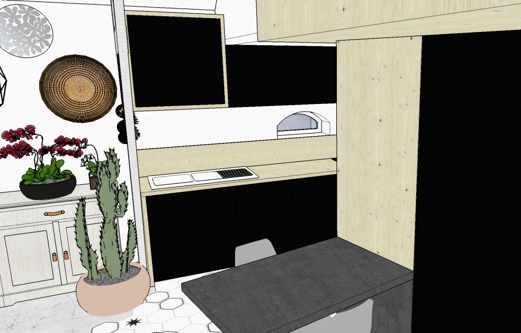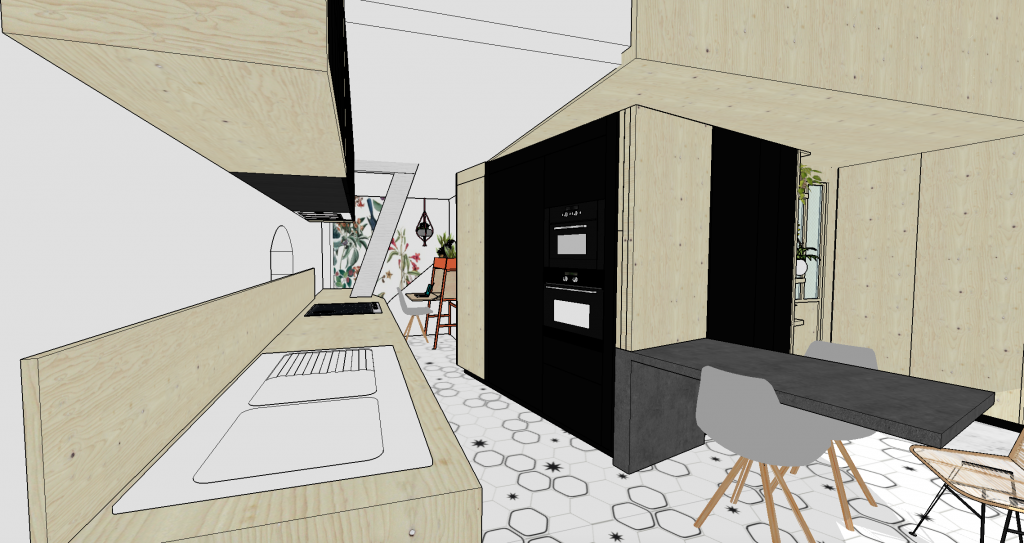 Voici la première proposition qui est faite à la cliente: Une cuisine aérée avec beaucoup d’espace, pas de bar mais une salle à manger intégrée à la cuisine pour libérer l’espace dans le salon, et une table modulable qui autorise les grandes réceptions.