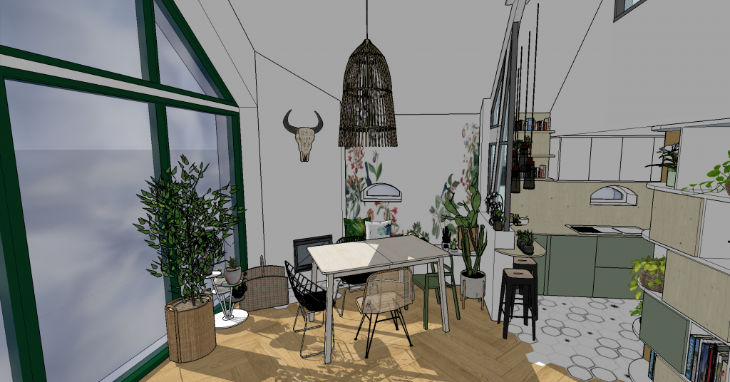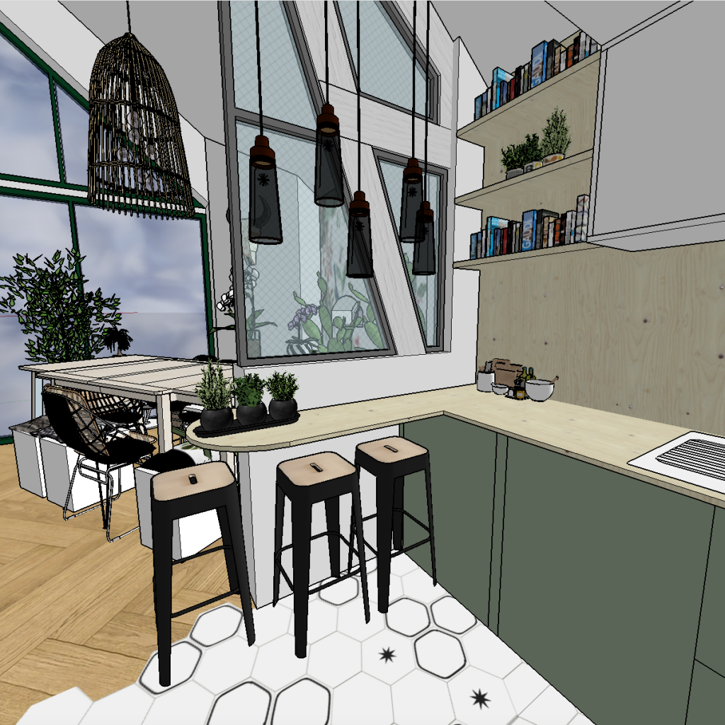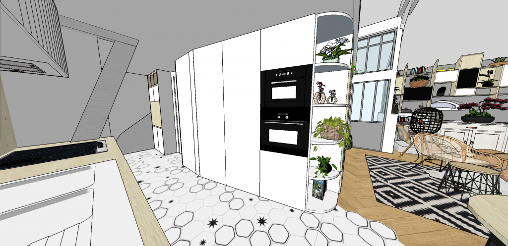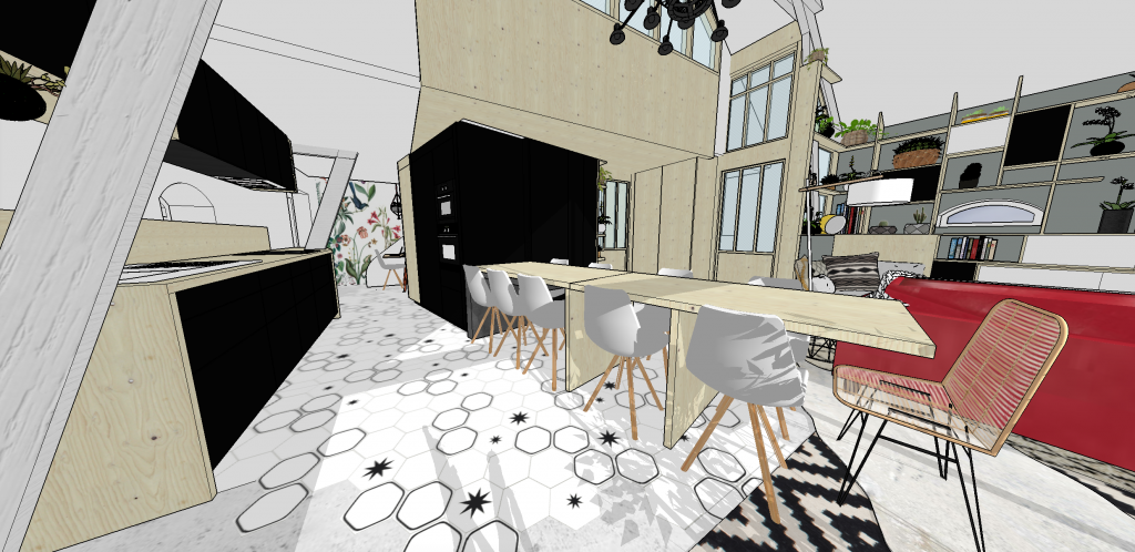 La seconde proposition vient quant à elle créer plus de « petits coins » et d’intimité. La cuisine est prolongée par des étagères formant un angle arrondi et vient créer un petit bureau qui est isolé de la pièce par un claustra laissant passer la lumière. La salle à manger est installée près de la cheminée, où un petit banc modulable avec des tabourets qui se déploient si besoin quand le nombre de convives augmente.