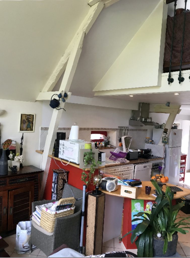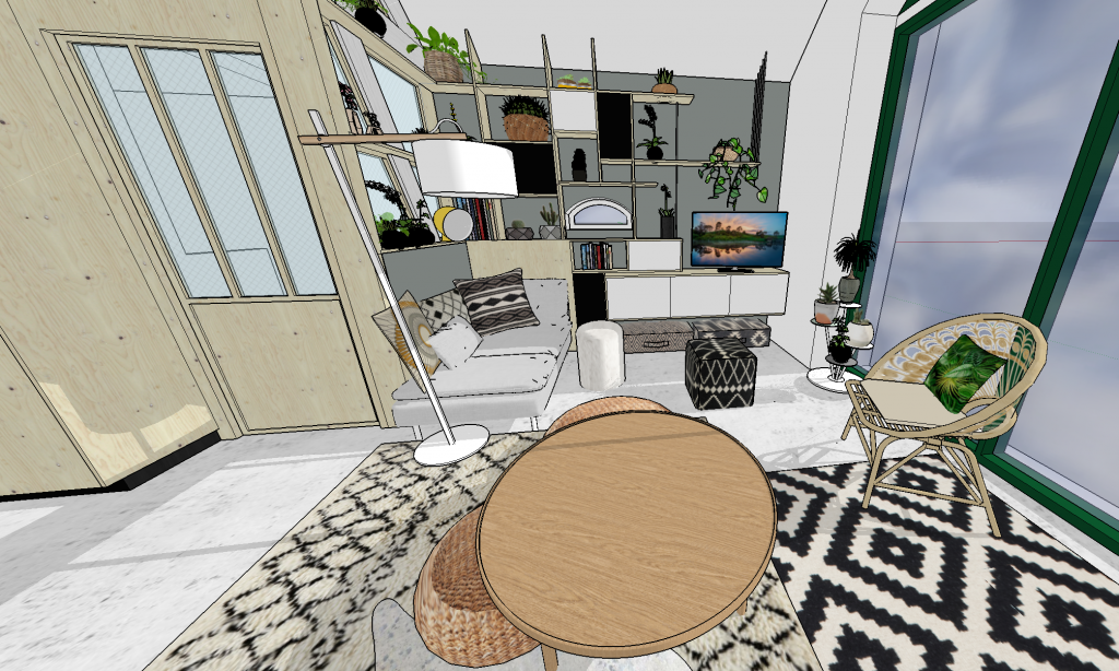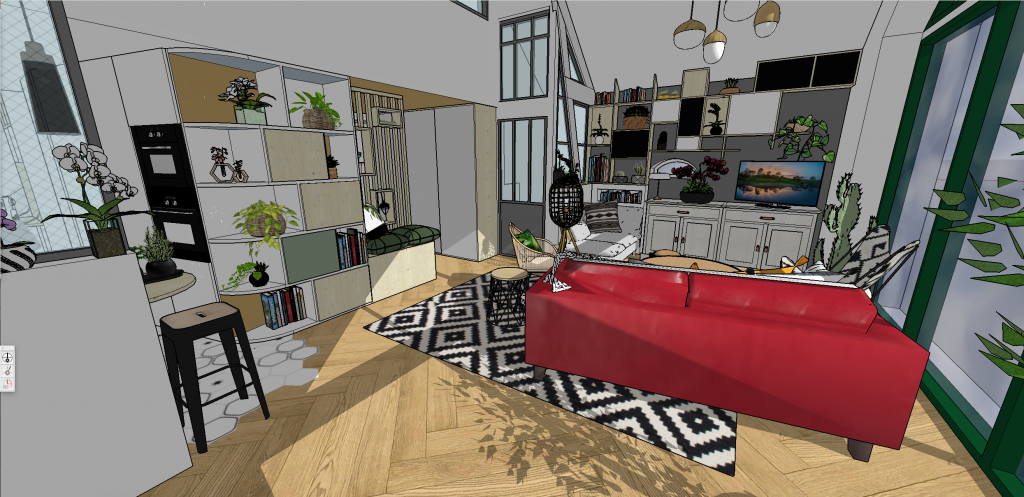 Ici, la cliente souhaite un travail de conception, avec des plans et une liste d’achat des matériaux et mobiliers pour une auto-réalisation. Elle souhaite conserver son canapé et son buffet, quitte à les relooker. Il faut intégrer dans le projet une solution pour fermer la mezzanine afin d’agrandir la chambre qui se trouve à l’étage.