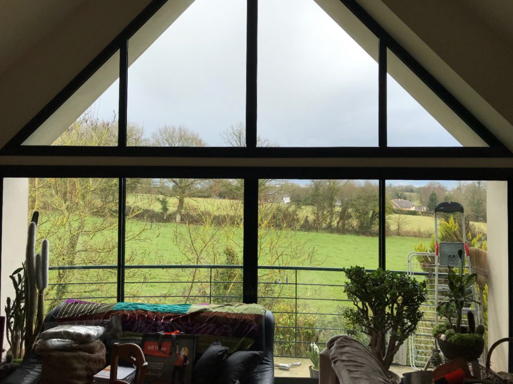 La mezzanine est fermée par une verrière et une verrière en rappel vient fermer la cage d’escalier, de même que le bar de la cuisine